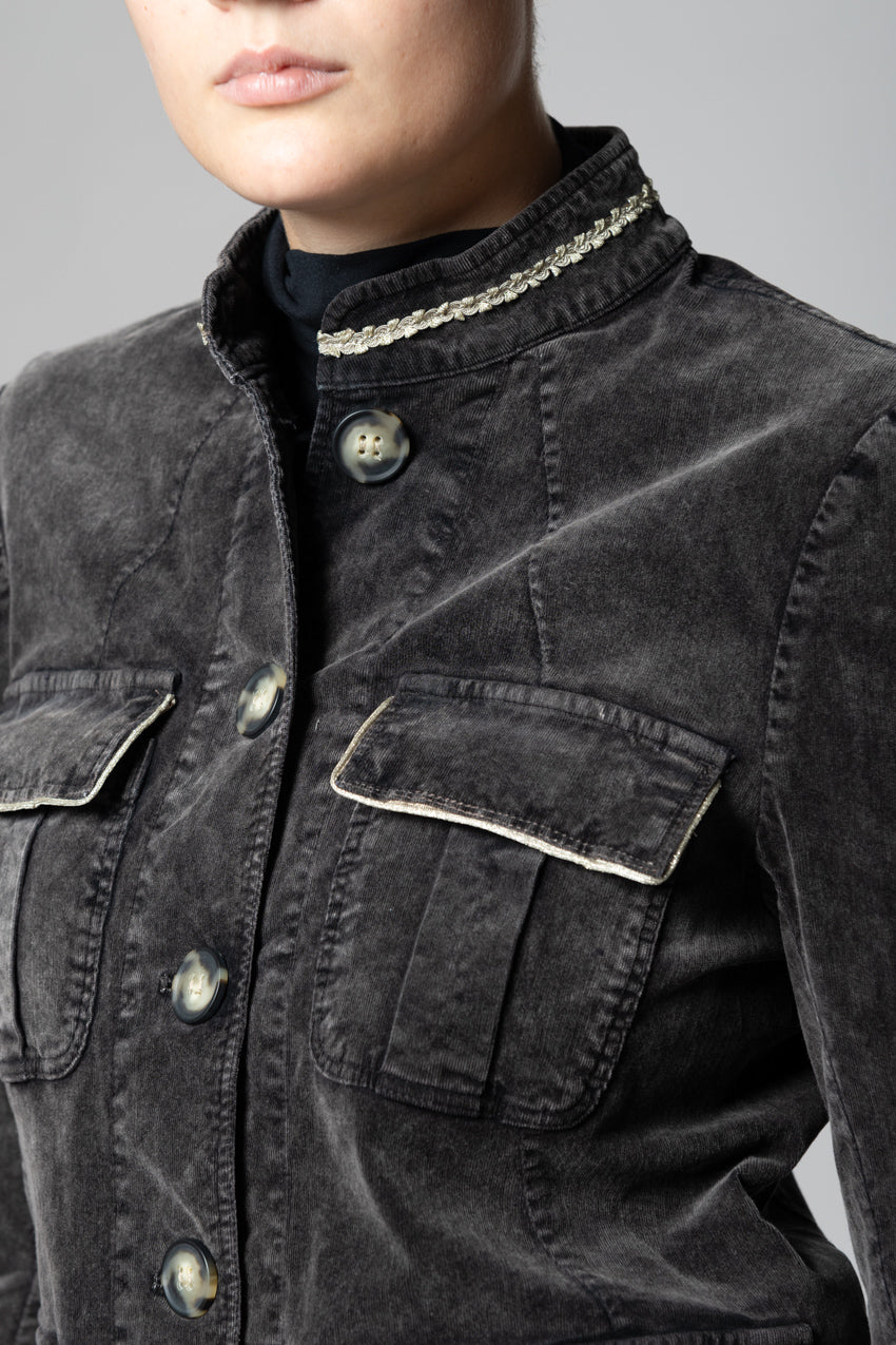 Karen: overshirt militare in velluto o jersey, perfetta per un’eleganza rilassata e confortevole.